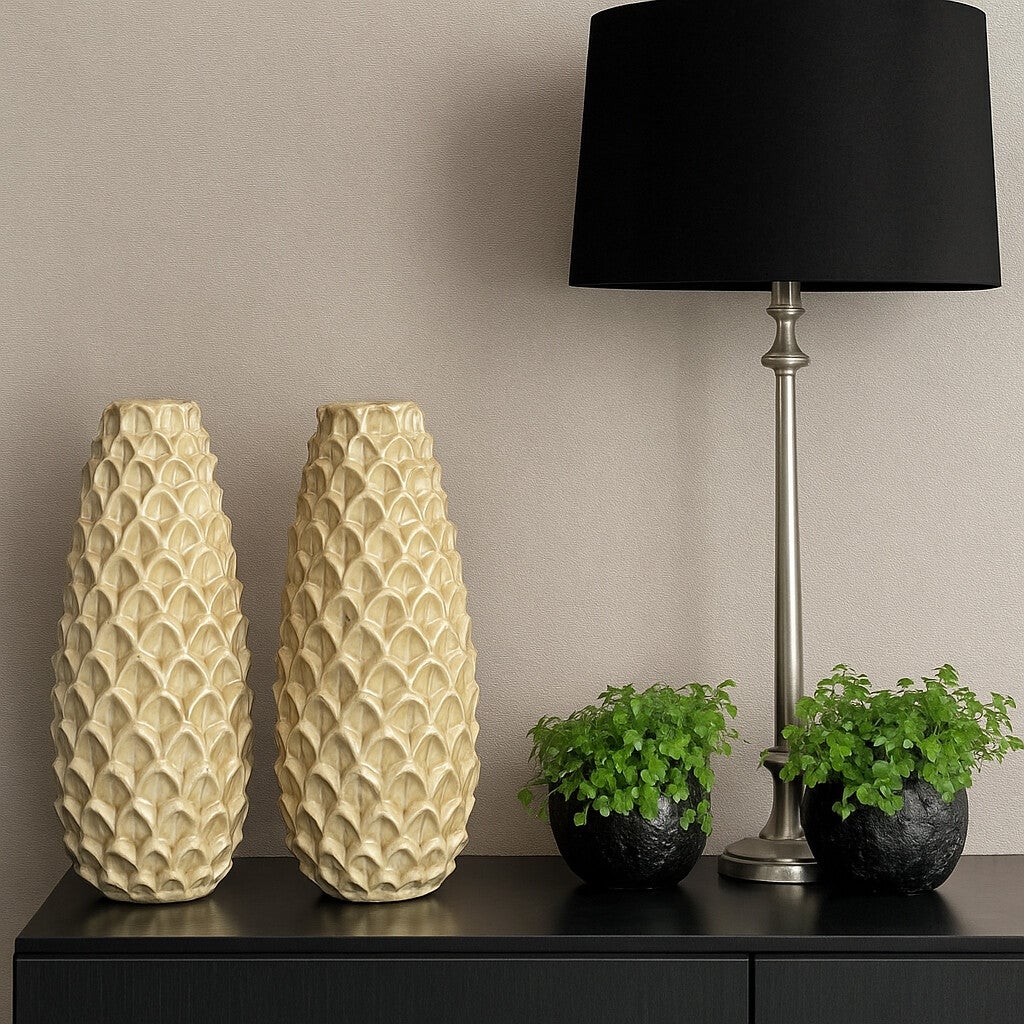 Deze elegante vaas met dennenappelstructuur brengt direct sfeer en warmte in je interieur. De subtiele zandtint en glanzende afwerking zorgen voor een chique uitstraling die perfect past binnen de hotek chique of naturel luxury woonstijl
