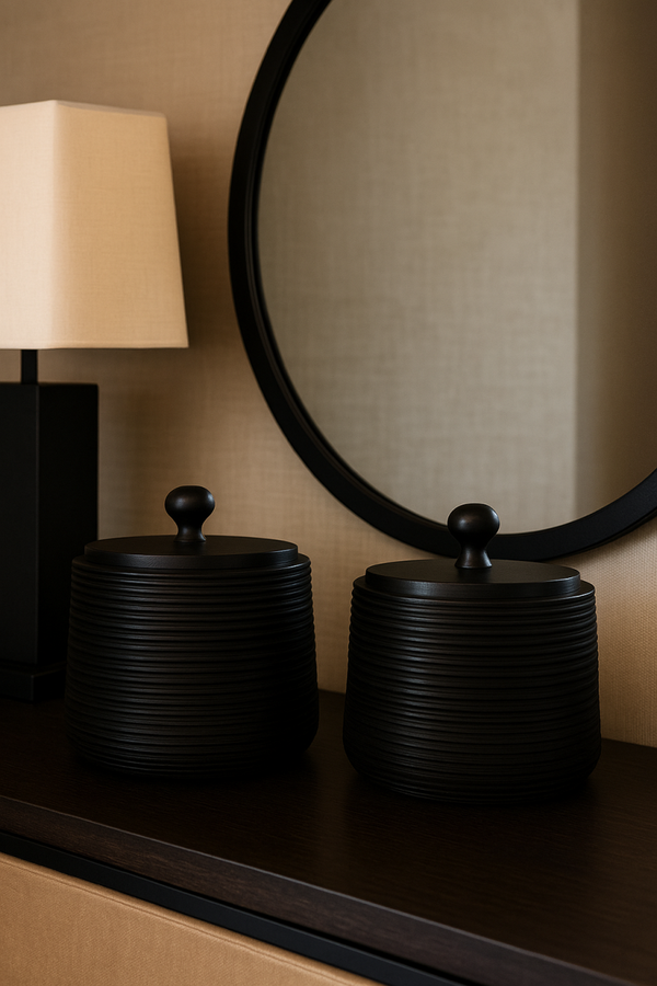 Een stijlvolle handgemaakte pot van donker mangohout met een subtiele ribbelstructuur. De natuurlijke afwerking en warme kleur geven deze pot een luxe uitstraling. Perfect om kleine items in op te bergen of als decoratief accent op een dressoir, bijzettafel open kast. combineer beide formaten voor een elegant en harmonieus geheel.
