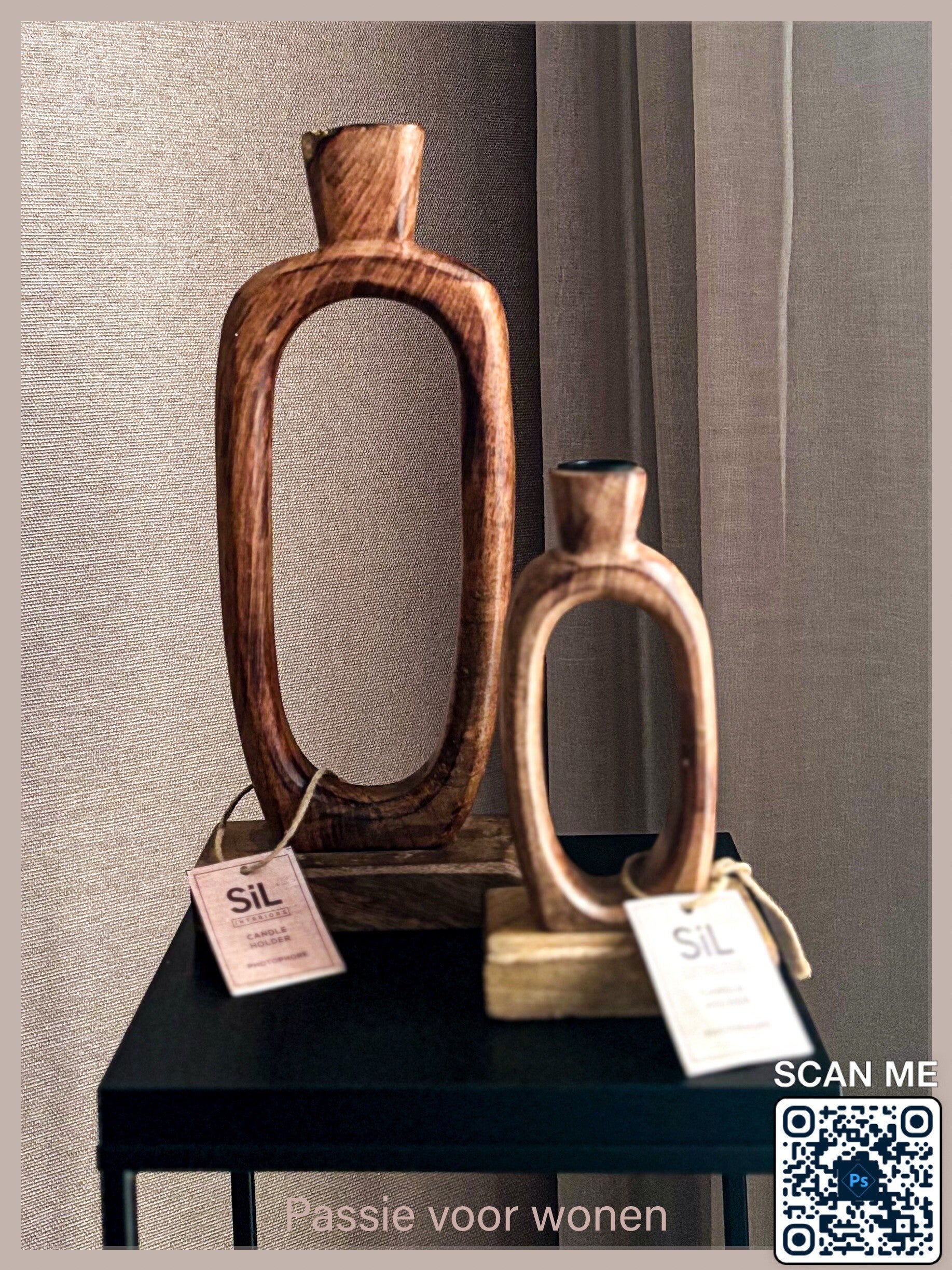 Deze prachtige set kandelaars van Sil Living Brengt warmte en karakter in huis. de organinische vormen en het natuurlijke houtpatroon geven elke kandelaar en unieke uitstraling. Dankzij het open design ogen ze luchtig en elegant- perfect te combineren met allerlei interieurstijlen.