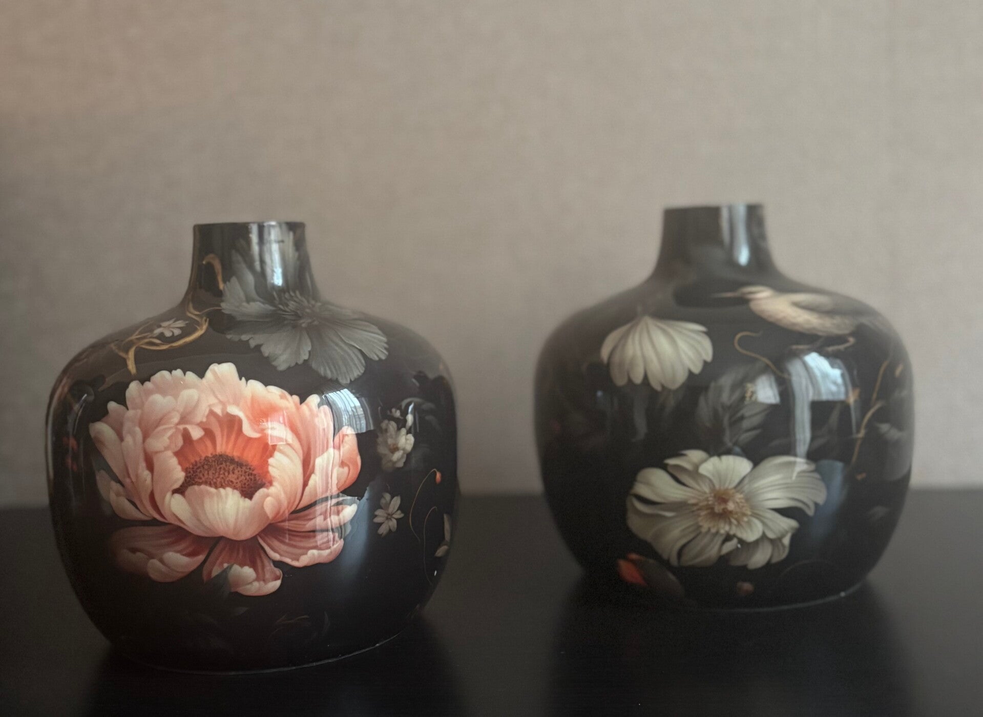 Caas pigeon zwart uit de bomont collectie. Een elegante zwarte vaas met luxe Bloemenrpint en glanzende afwerking. Een stijlvolle eyecatcher voor elk interieur.