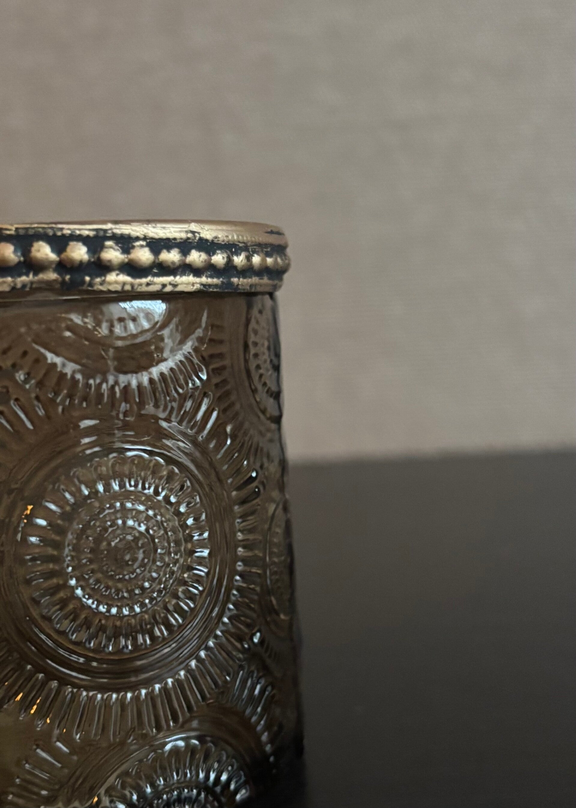 Deze theelichthouder is gemaakt van glas met een fijn motief. De goudkleurige rand geeft een warm en stijlvol detail.