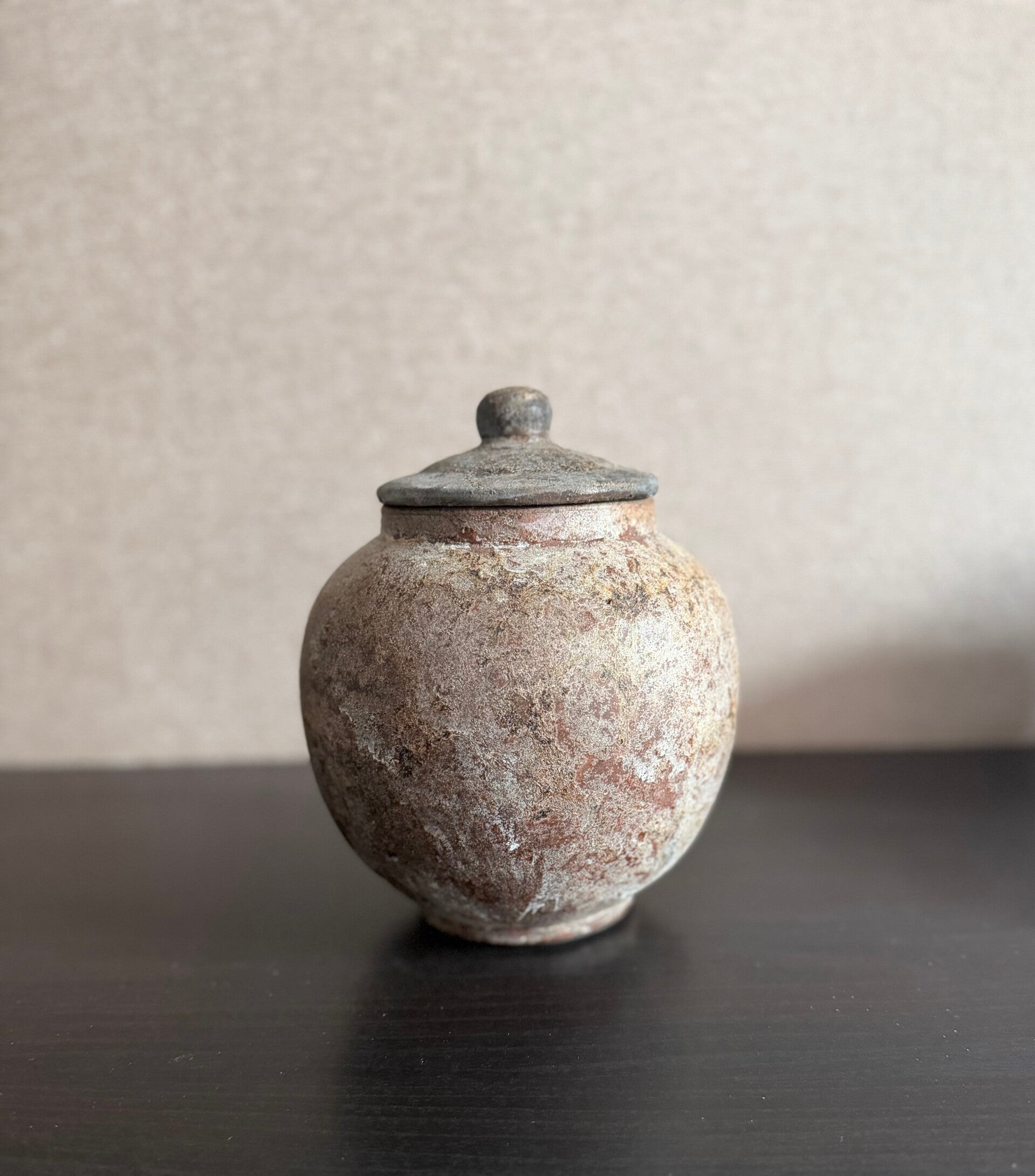 Een decoratieve pot met deksel van steen met een warme, rustieke uitstraling. Mooi als opbergpot of als sfeervol accessoire op een tafel, kast of dienblad. Door de natuurlijke uitstraling past deze pot in veel verschillende interieurstijlen.