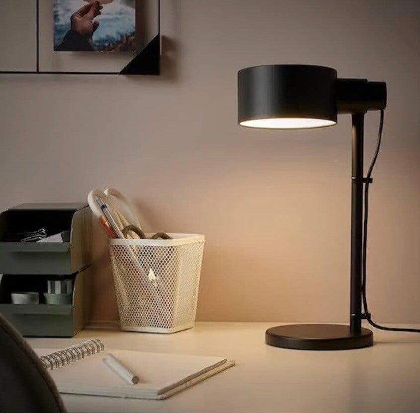 Strak zwart tafellampje van IKEA met een modern en minimalistisch design. Perfect als sfeerlamp op een kast, nachtkastje of bureau. Door de matte zwarte kleur past deze lamp gemakkelijk in verschillende woonstijlen.