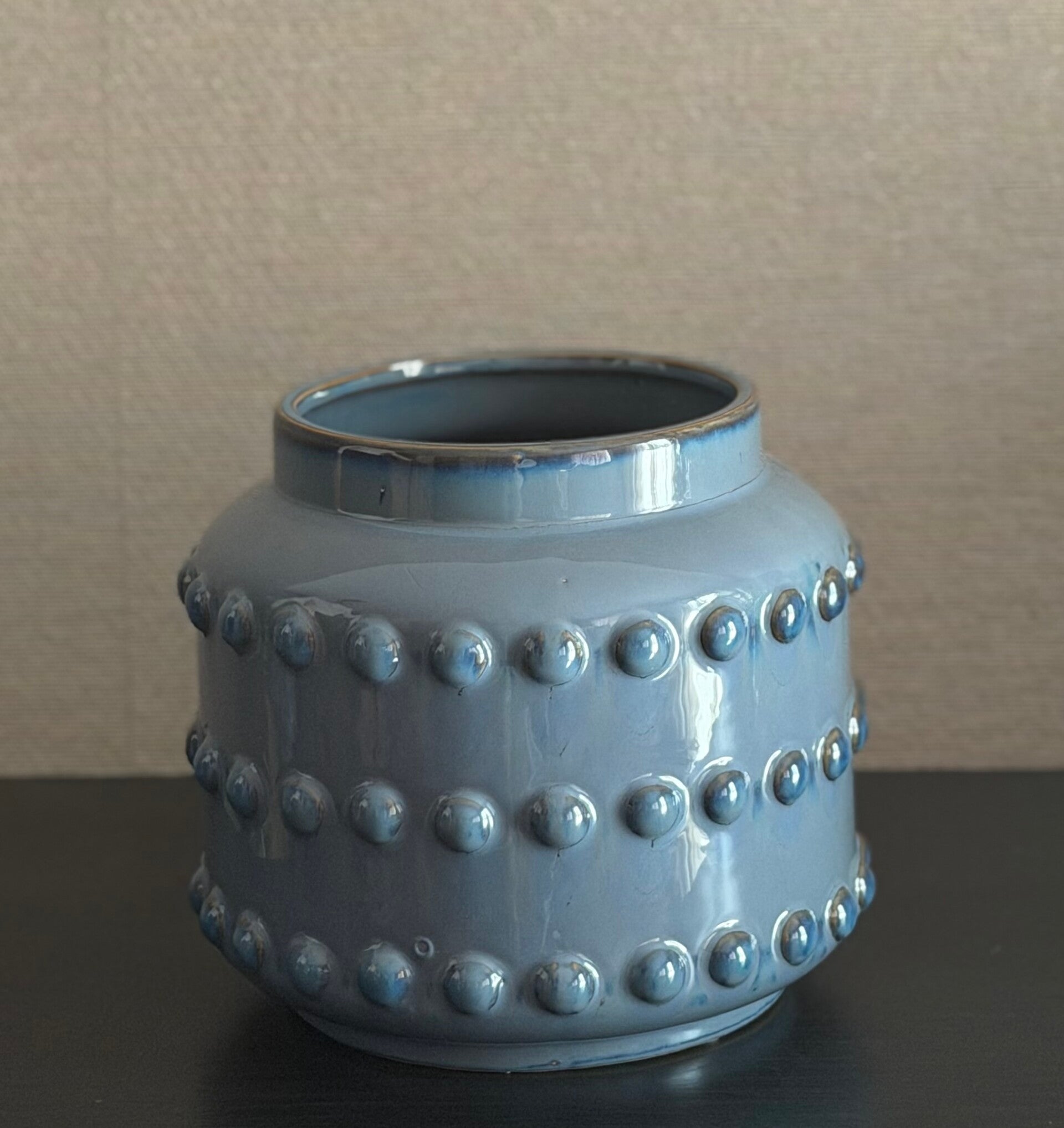 De Migliore vaas valt direct op door zijn unieke vorm en speelse bolletjesstructuur. De zachte blauwgrijze kleur in combinatie met de glanzende afwerking geeft deze vaas een stijlvolle en rustige uitstraling.